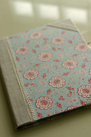 ピンクと水色の柄の生地で作ったバインダー。縁取りには麻の布とレースのリボンを使いました。