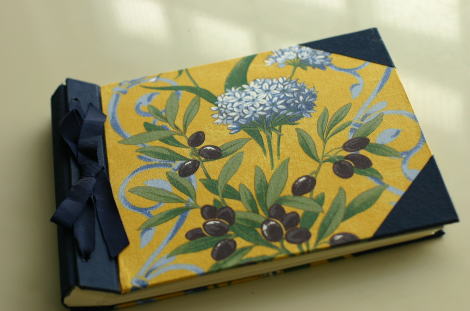 黄色いオリーブの生地は、何年か前にテーブルクロスとして買ってきた布でしたが、テーブルにかけてみたらあまり合わなかったので、ずっとしまっておいていたものです。思いがけずアルバムに生かせました。
