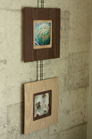 この作品も、同じくグループ展の共同製作の一つとして作りました。皆が違う生地でフォトフレームを作り、壁にたくさん並べて展示しました。