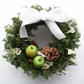 玄関のドアのところに飾るクリスマスリースを作りました。今回は、青りんごとアイビーをアクセントにつけてみました。