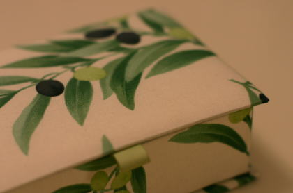 先日、吉祥寺のコットンフィールドでオリーブ柄の生地とリボンを買ってきたので、今日のレッスンの見本に、写真のダストボックスを作ってみました。中はスキバルテックスという、表面が皮調の加工がしてある紙を使っています。