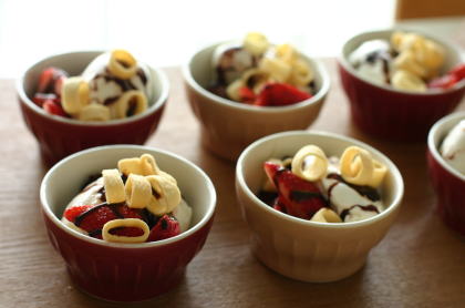 子ども達はおいしそうって喜んでくれたけど、実は冷凍してあったチョコレートスポンジの残りと、いちごとMOWバニラアイスに、ハーシーのチョコシロップとポテトのスナック菓子のせた、一見手作り風(?)のおやつでした。