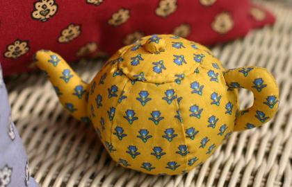 写真のティーポットは、オリヴェットで見せていただいたピンクッションなんですよ。かわいいでしょう。大きさは、直径8cmくらいだったと思います。