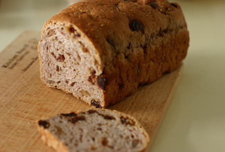 ネットで見ると「野草酵母使用、赤ワイン仕込みで、レーズン、白胡麻、くるみ、デーツ入り」と、ただものではなさそうなパンです。