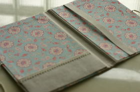 ピンクと水色の柄の生地で作ったバインダー。縁取りには麻の布とレースのリボンを使いました。