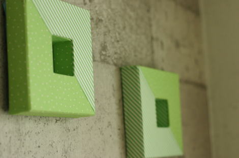 壁に飾るオブジェとしてのカルトナージュ。グループ展ではブルーとグリーンの生地で統一して、皆で2個ずつ作って、壁一面にたくさん並べました。