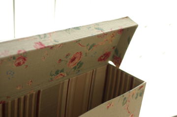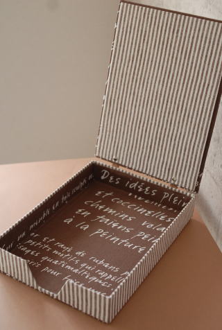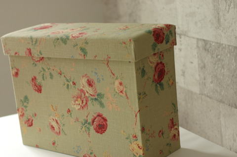 その後、ふと思いついてはさみやヘラなどのカルトナージュの道具を入れてみたら、これがなんとも使いやすくて、結局私は、リモコンボックスとして作ったこの箱を、カルトナージュの縦型お道具箱として使い始めました。