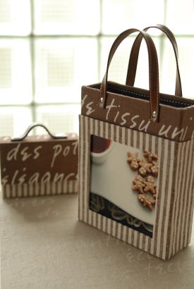小さな手提げバッグをカルトナージュで作って、正方形の写真を飾れるようになっています。