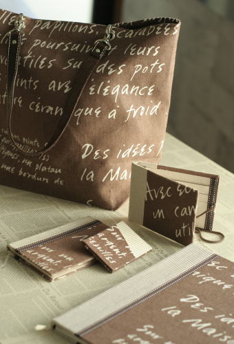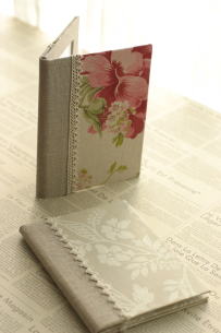 あじさいのリネン生地で、おそろいのペンスタンドと手帳カバーを作りました。