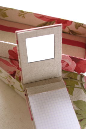 生徒さんから、カルトナージュの携帯用鏡のレッスンをというご要望が出て、どんなデザインにしようかしらと色々考えて行き着いたのがミラーメモ。メモ帳と手鏡を一つにして持ち歩けるというものです。