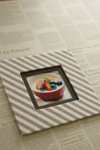 工作用の木の板に平らな綿を入れて、お気に入りのエイミーの生地を張りました。周りには茶色のグログランリボンを1周巻いています。