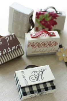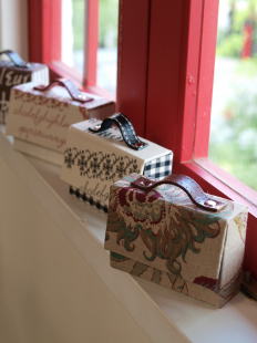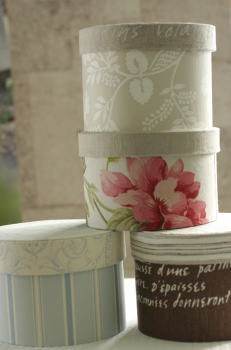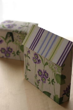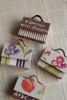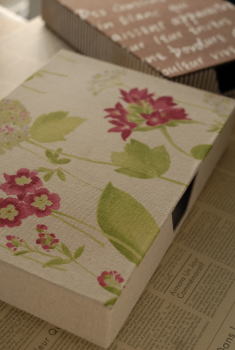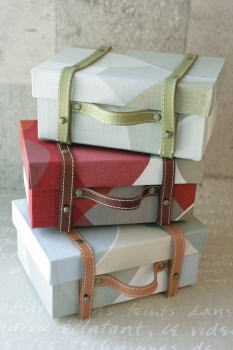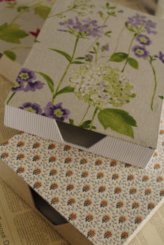 手前の縦型のお道具箱は、蓋を開けると中に3つの仕切りが付いていて、カルトナージュのお道具を立てて収納できるようになっています。