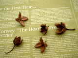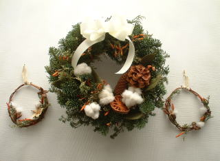両側に写っている小さいリースは、お花屋さんで枝を買って、それを2重に巻いて直径12cmくらいの輪を作り、巻き終わりをワイヤーで結んでリースの土台にしました。そして、大きいリースの材料の緑の葉や唐辛子などを少々使い、ワイヤーで留めていきました。それから、ちょっと珍しい貴重な材料も友達からもらったので使いました。それは、世界遺産「白神山地」のブナの実です。白神山地は、青森県と秋田県にまたがるブナの原生林の茂る地域で、鹿児島県の屋久島と並んで日本でただ2つの世界自然遺産となっているところです。山形に住んでいる友達が、白神山地に旅行に行った時に拾ってきてくれて、リースの材料にといただきました。ブナの実を見たのは初めてだったのですが、お花みたいなとってもかわいらしい形をしています。大きさも2cmくらいで小ぶりなので、大きいリースにつけたのでは目立たないように思ったので、ブナの実に似合うような小さいリースも作ってみました。白い飾りは、コットンフラワーの綿なので、一つ一つにコットンの種も入っています。