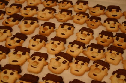 クッキーのキャラクターに選ばれたのは、村田朋泰氏の作品の「白の路」などに出てくる男の人(名前はついていないようです)の顔です。作業はほとんど粘土細工の世界ですが、1枚1枚丁寧に白と黒(ココア)の生地で形作っていくので、結構時間がかかります。