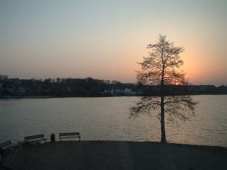 アパートの窓から、湖の向こうに上る朝日を眺める。