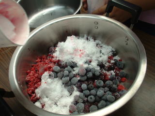 ブラックベリー、ラズベリー、ブルーベリーの3種類で作るミックスジャムです。できたてのジャムのおいしかったこと!