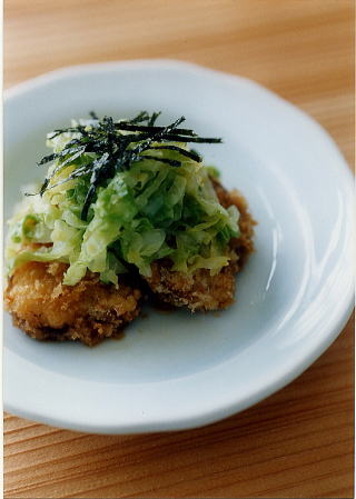 とんかつに、柔らかく炒めたせん切りキャベツをたっぷりのせて、お醤油味のたれをかけ、きざみのりをのせてあります。