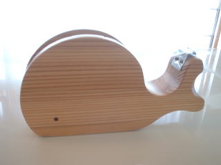 インターネットで色々検索してみたら、ようやくありました。くじらの形のテープカッター。これだったら、かわいいので子ども達も喜ぶし、木でできているから扱いやすくて味わいもあると思い、さっそく取り寄せました。