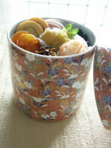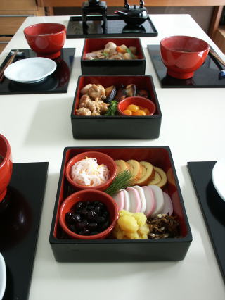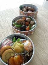 元旦の朝、右の写真のようにおせち料理を家族で食べた後、陶器の丸い3段重ねの器に2人分の料理を詰め合わせ、近くの両親の家に届けに行きます。以前は、母はおせち料理を色々手作りしていたのですが、一時体調を崩してから体力が落ちてしまい、それ以来、私が作っています。
