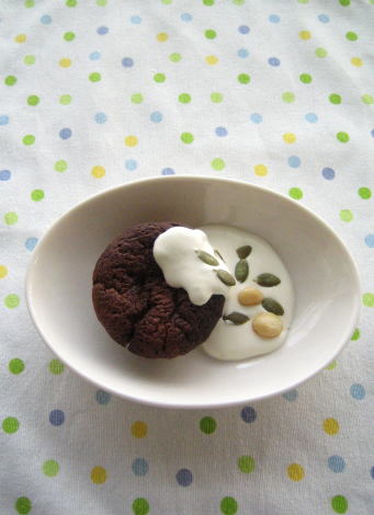 途中、ちょっと休憩のティータイム。前に作ったチョコレートケーキがあったので、生クリームとかぼちゃの種、マカデミアナッツを少しのせて・・・ そうだ、ついでにこれもカメラでパチリ。