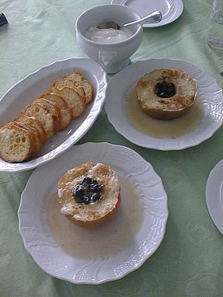 (5)生クリームにグラニュー糖とシナモンを加えて泡立てて、焼けたりんごにのせ、シナモンをふりかける。