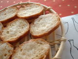 (1)フランスパンを7mm厚さに切る。オーブンプレートの上に網をのせ、その上にパンを並べる。(網がない場合は、天板の上に直接並べてもOK。)